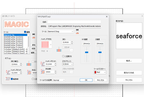 材料の特性に応じて設定した速度、深さ、出力などの情報を保存できます。