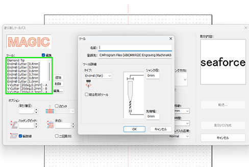 ダイヤモンドチップやエンドミルなどの様々なツールに関する情報を包括的に管理し、ツールパスの作成時に選択できます。