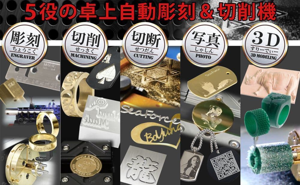 「高性能」「簡単操作」「低価格」を実現した彫刻機が遂に登場! 文字やオリジナルロゴの彫刻、切削、切断、3D立体彫刻などが可能です。「回転自動彫刻」は、回転装置が指輪やパイプなどの円筒形への彫刻も可能にしています。Magicシリーズは、使いやすさを考えて作られたデジタル時代の彫刻機です。パソコンが苦手な方でも簡単に使えるように作られている高性能専用ソフトが標準付属。パソコンで自由なレイアウト、マーク、フォントを使用し、簡単に彫刻できます。USB接続なので、Windowsパソコンがあればすぐに使い始められます。
